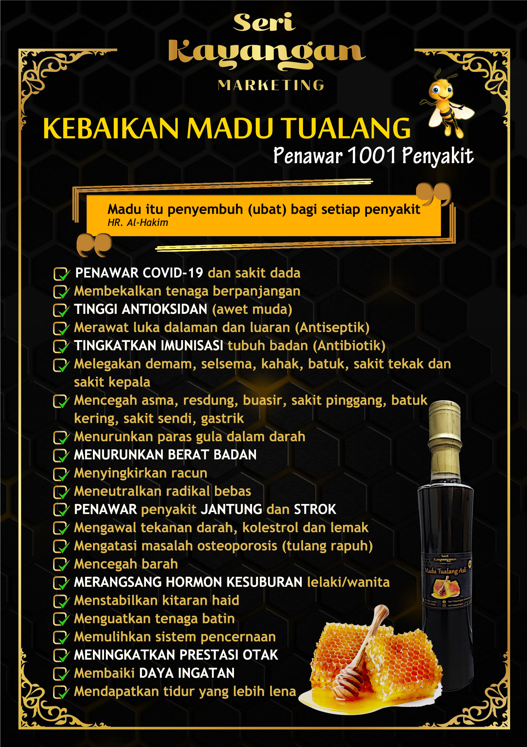 Madu adalah makanan yang sangat bernilai telah digunakan sejak zaman purba lagi sebagai sumber makanan bertenaga yang penting dan merupakan satu-satunya makanan yang tidak akan rosak/basi walaupun disimpan beribu tahun. Madu mempunyai 1001 khasiat sehingga disebut dalam kitab Al-Quran untuk menyembuhkan pelbagai penyakit antaranya: